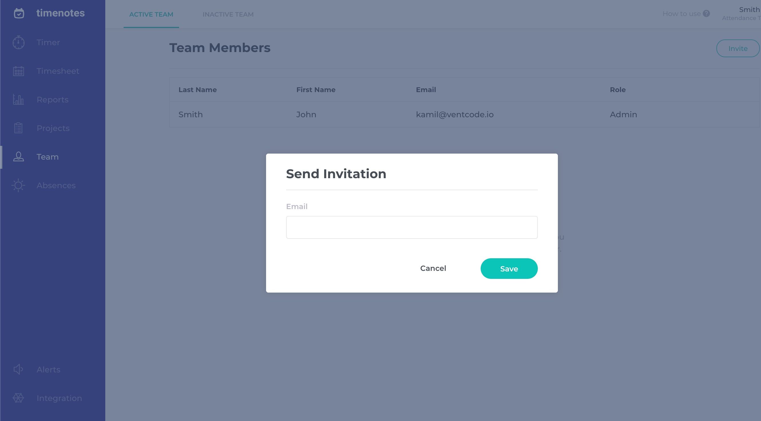 Onboard team members in seconds by sending email invitations directly to them. All you need to do is put team members' addresses in Timenotes and ask them to confirm invitations.