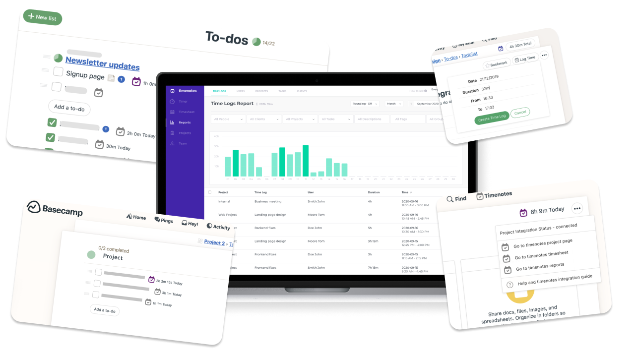 Next to tracking the time directly in Basecamp, all your tasks will also appear in Timenotes and synchronise any changes. Use Timenotes web interface, mobile app or web extension and powerful Timenotes timesheet interface.