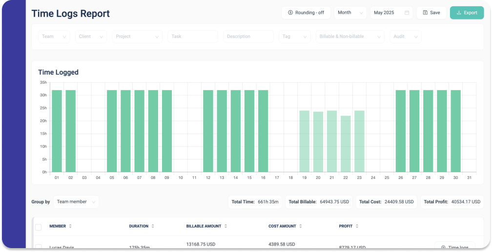 Build customizable reports based on time tracked in Basecamp projects and to-dos. Use flexible filters and grouping to turn Basecamp time data into clear, actionable insights, and save report settings to speed up recurring reviews and billing.