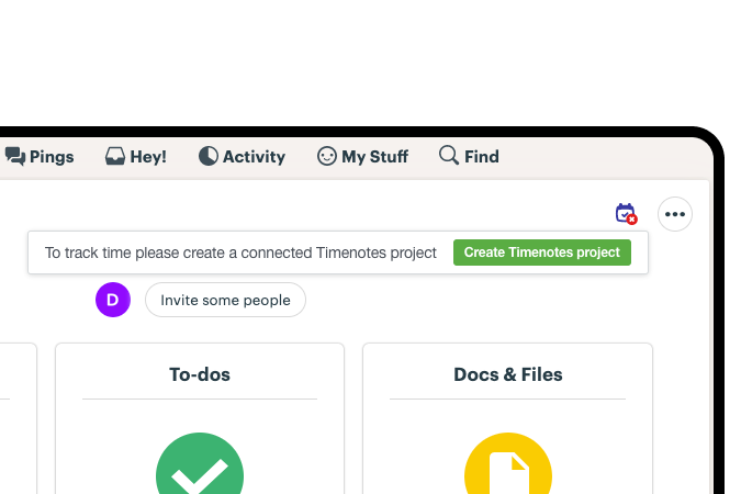 Connecting Timenotes to Basecamp is intuitive and easy. After signup with with your Basecamp account you can add Basecamp time tracking directly in Basecamp or in Timenotes with a single click.