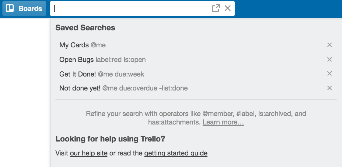 There are many, many more search operators to use, but the best thing is you can combine them into tandems. For example, @me due:overdue -list:done will return all of your cards that are overdue and not done.