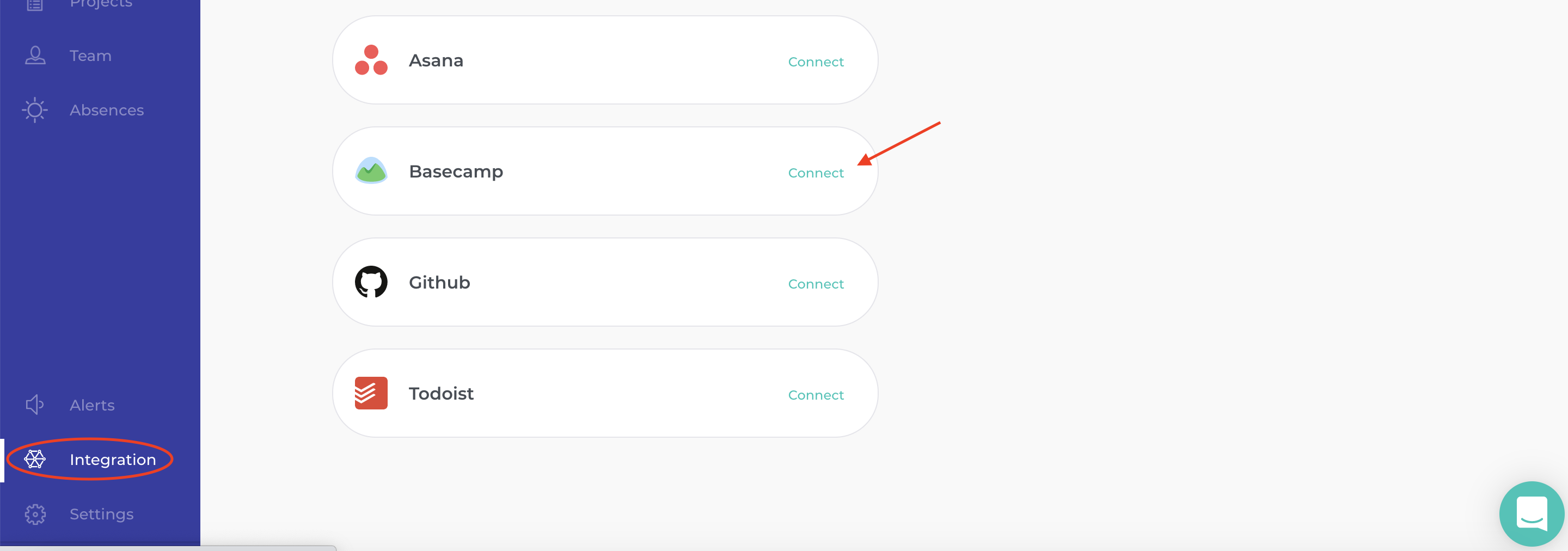 3. Go to Timenotes and choose the 'Integration' section on the sidebar, then click on the 'Connect' button next to Basecamp.