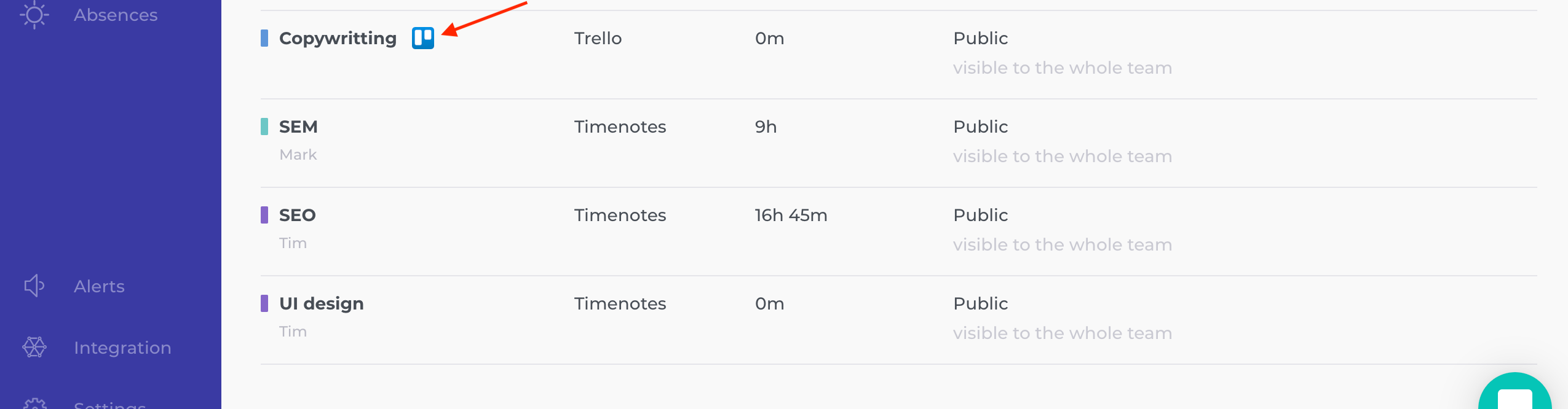 4. Decide which Trello projects you would like to track with Timenotes. Enter each project in Trello and click on the Timenotes icon or go to Timenotes and create there Trello connected projects. After connecting, the projects should be seen in ‘Projects’ section on the sidebar in Timenotes.