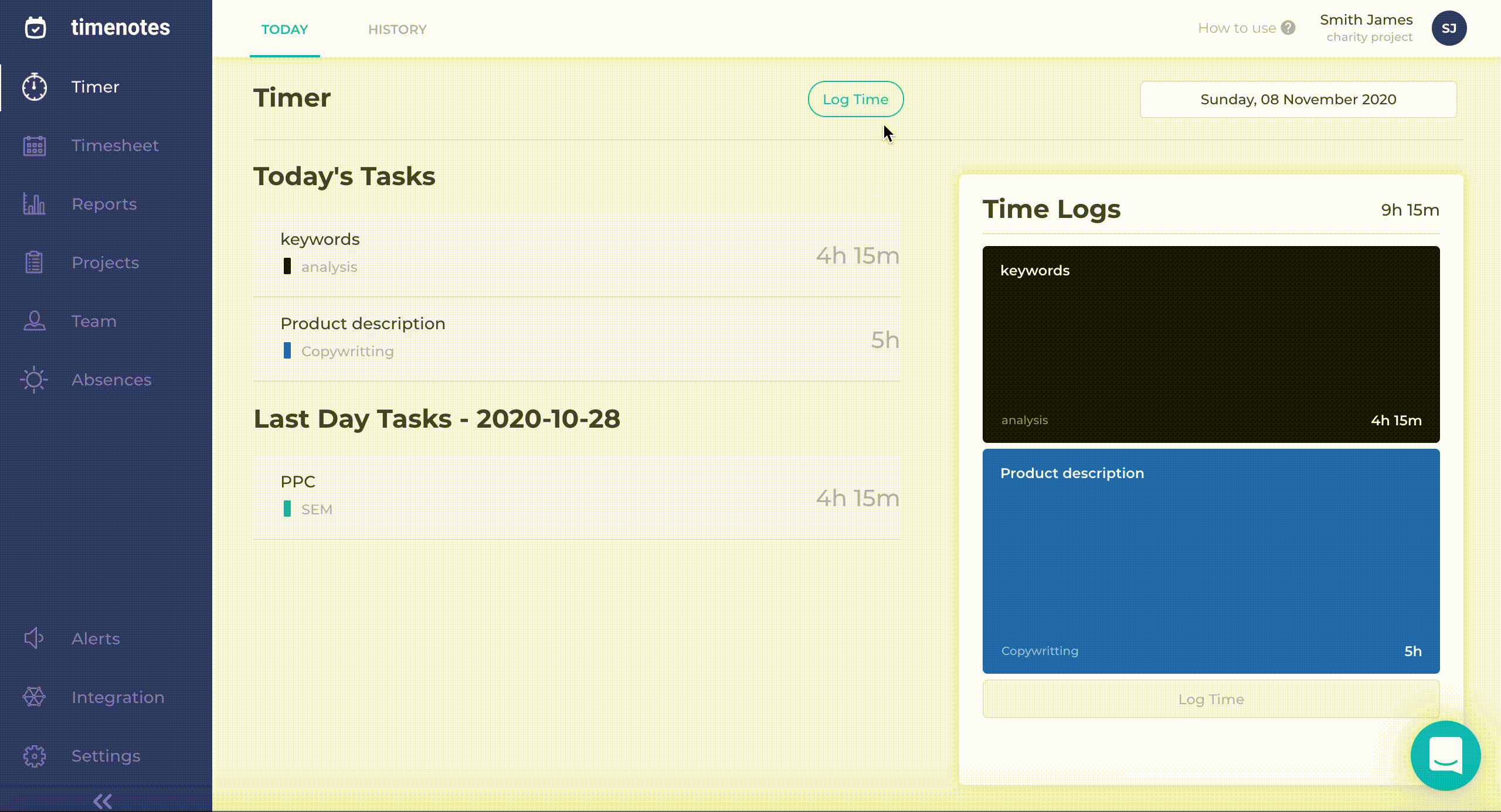 You can track Trello projects also traditionally in Timenotes. Enter ‘Timer’ on the sidebar and start Tracker or add time logs. Thanks to Timenotes all time logs are perfectly synchronised with Trello projects. Timer is also accessible in our mobile app so you can start and stop it whenever you need, even if you are away from your desktop.