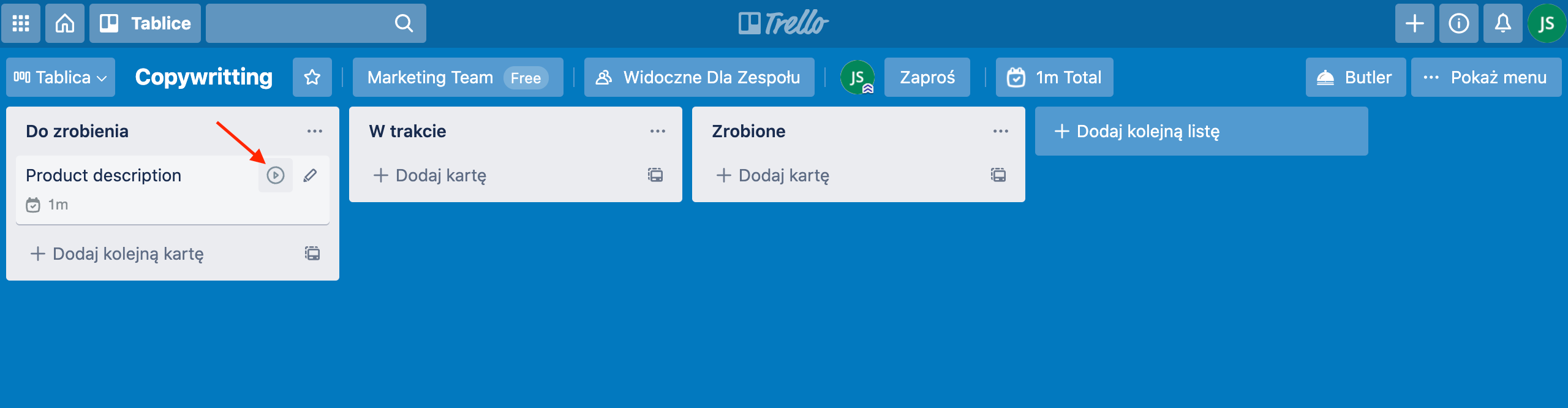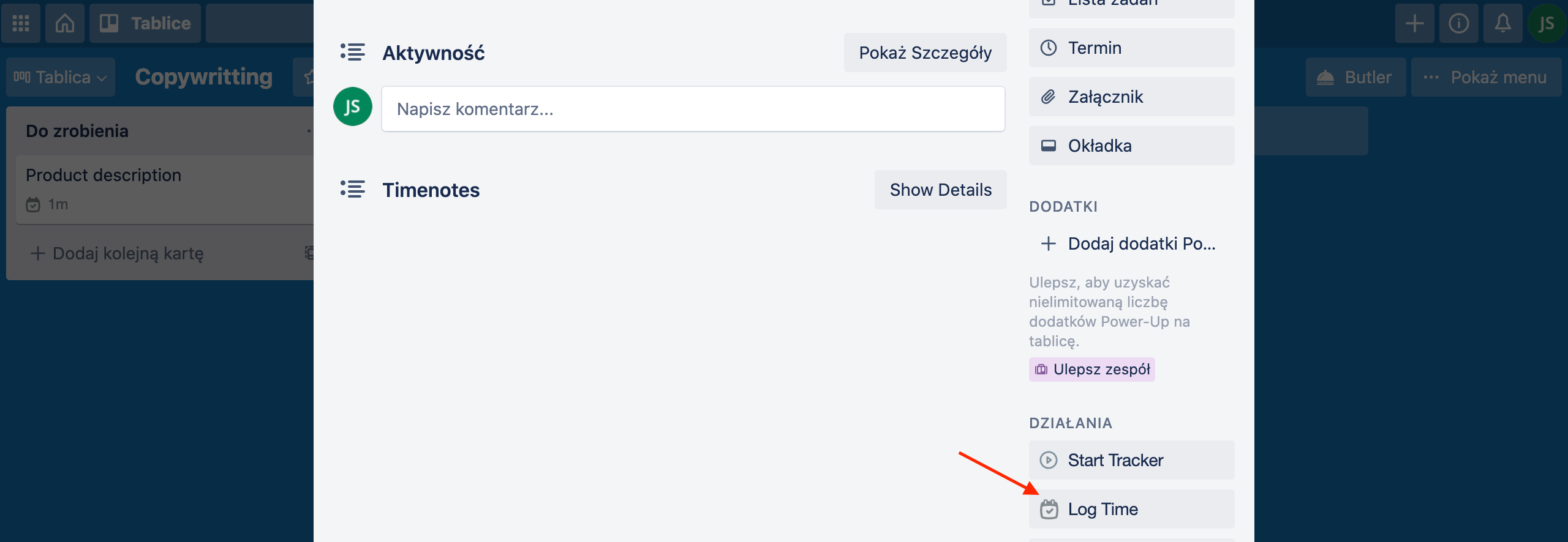 Close to projects’ names in Trello, there is the start/stop button. Just click on it, when you want to start/stop tracking time for a particular Trello project. If you want to add time log in Trello, click on the project, go down to the ‘Actions’ section and select “Log Time”.