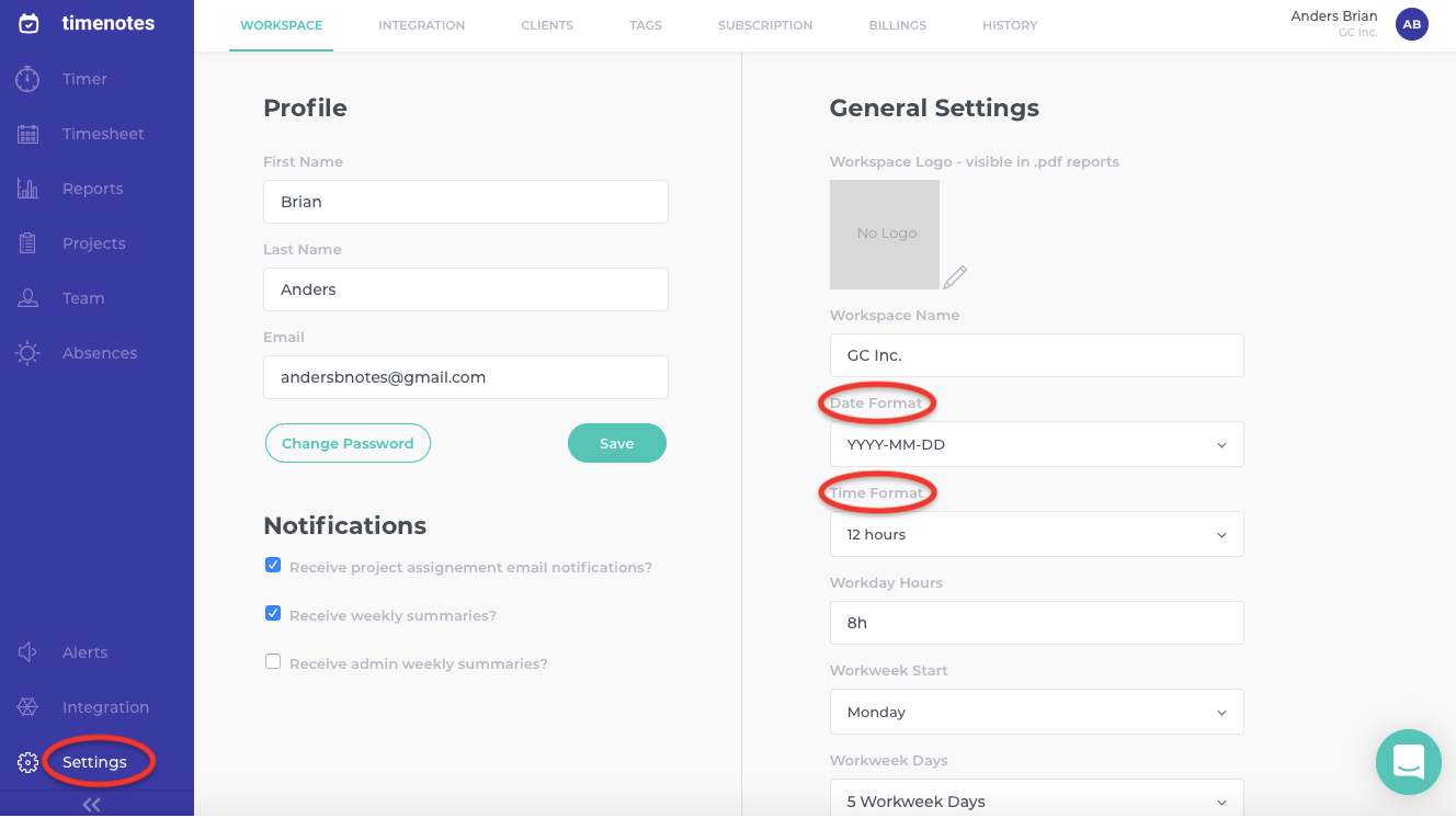 To change the date and time format, access the "Settings" section in the bottom left corner of the sidebar. Next, in the "General settings" column, change the date and time format to your liking. Modify workday hours, the number of workweek days, as well as what day the workweek starts for comfort-of-use reasons. These modifications will change the colors and shades on your timesheet for your visual comfort.