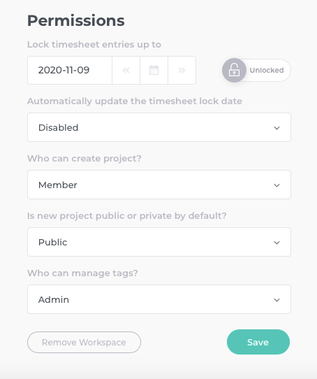To configure, who can create and mangage projects, access the "Settings" section in the bottom left corner of the sidebar, then scroll down to the "Permissions" column on the right side of the screen. Configure if you want new projects to be public or private by default.