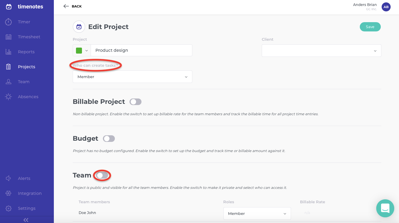 In addition to managing Projects settings, you can also manage who can create tasks in a particular projects. To manage this setting, go into "Projects" and then click "Edit" on the project you want to modify. Configure who can create tasks in the project. Flick the "Team" switch to make the project visible only to chosen members. You can also do all of this when creating a new project.