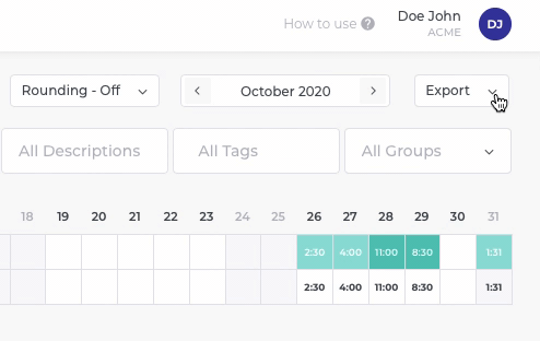Export a timesheet by going into the "Timesheet" section on the sidebar and clicking the "Export" button in the top right of the screen. Choose the preferred format to start downloading the timesheet.