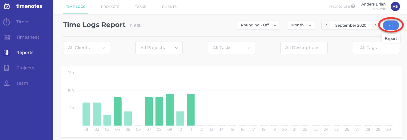 Export a report by clicking the "Reports" section on the sidebar, select the month you want to export and click the 3 dots in the top right corner. Afterwards, you should see a pop-up window. Use it to customise the elements and format of your report. When you're ready click "Export" and wait for the file to be downloaded.