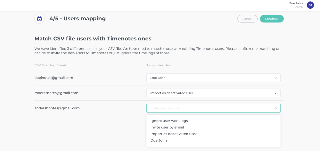 Import time logs with or without inviting users - If you wish to import time logs without inviting the member, select the "Import as deactivated user" option. Later, you will be able to reactivate and invite the user. To import time logs and simultaneously invite members, select "Invite user by email"