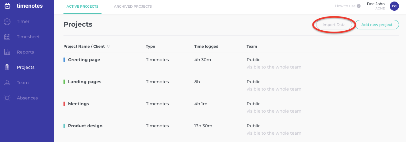 Getting the import process started - Go into "Projects" on the sidebar and click "Import data" in the top right corner.