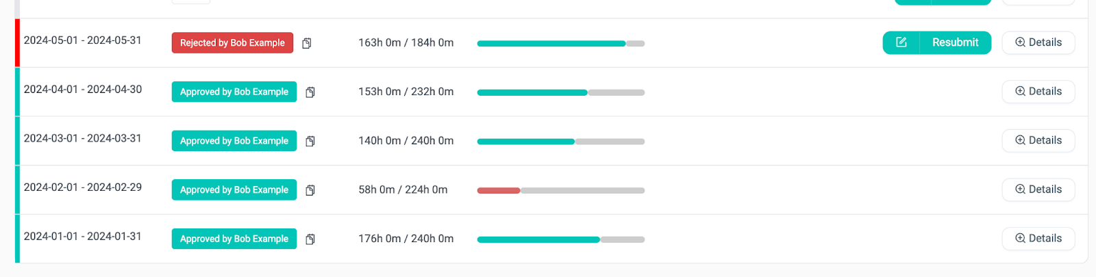 To review an exact timesheet submitted for approval, an admin can click the "Details" button on the period overview table. This view allows the admin to review the summary of time logged in the submitted period with action buttons to make decisions.