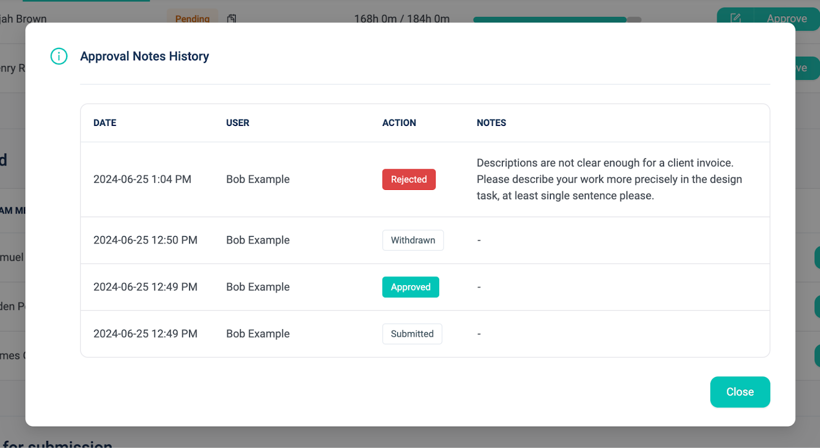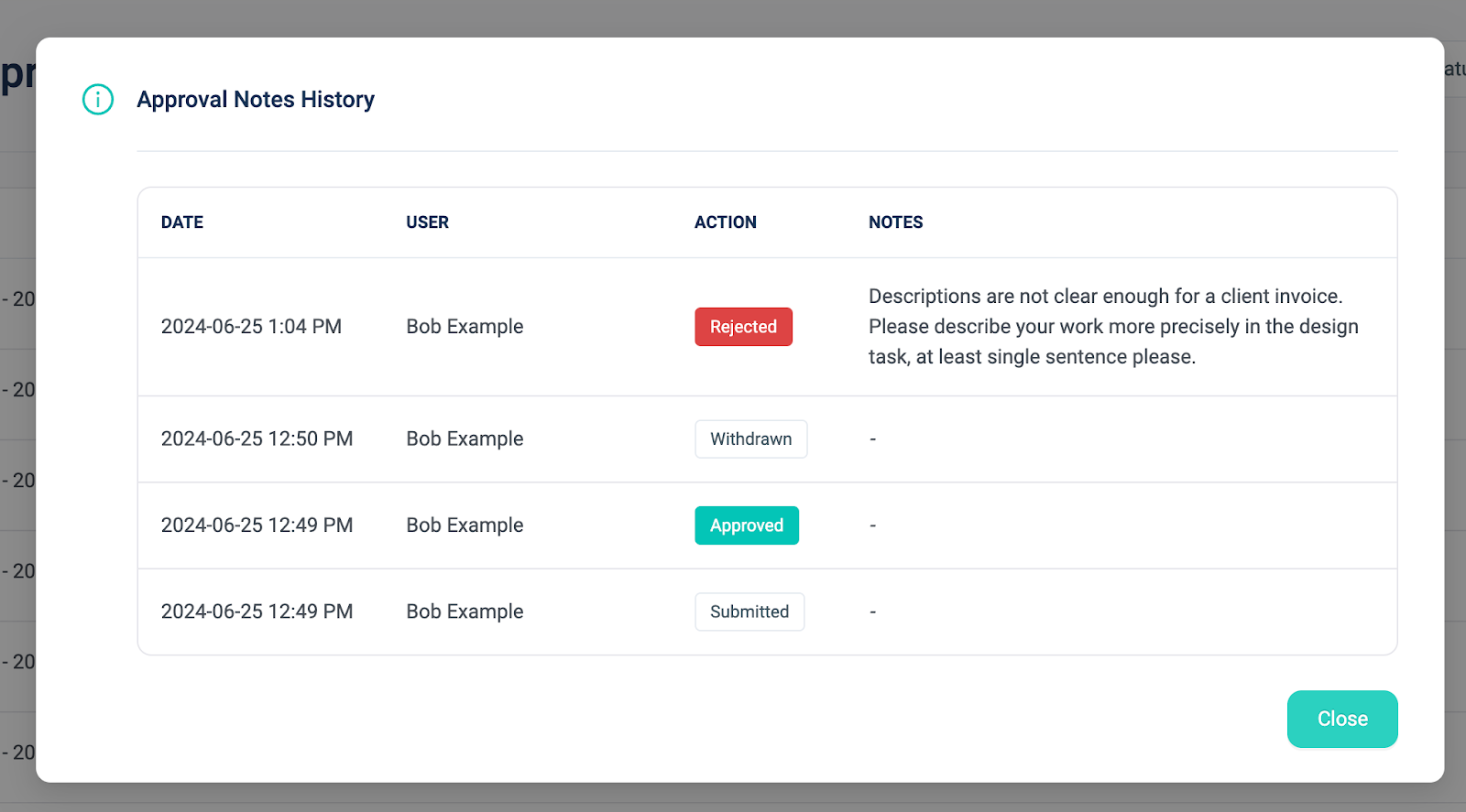 In addition to email notifications, all actions and their respective dates will be stored as an action log for each active approval submission. This log can be accessed later under the notes icon, providing a historical record of who approved or rejected the timesheet and the reasoning behind the decision.