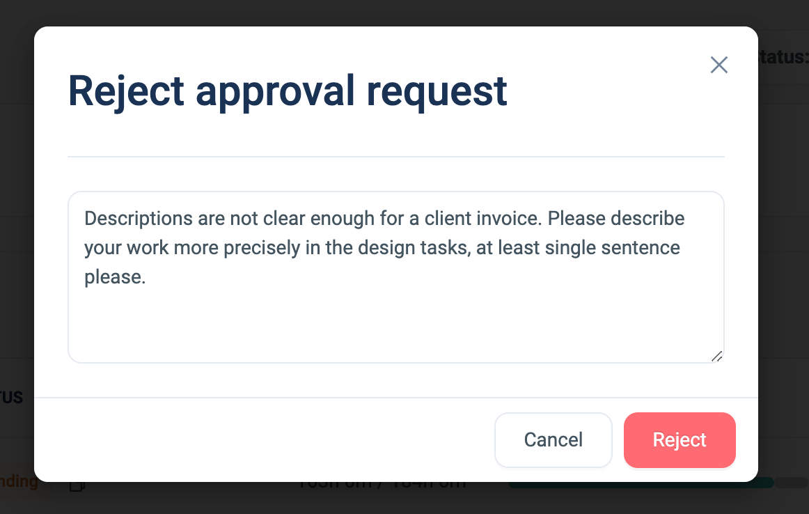 There is also an option to attach a note to a decision, allowing clear communication to team members about what is missing in a timesheet and what corrections are expected.