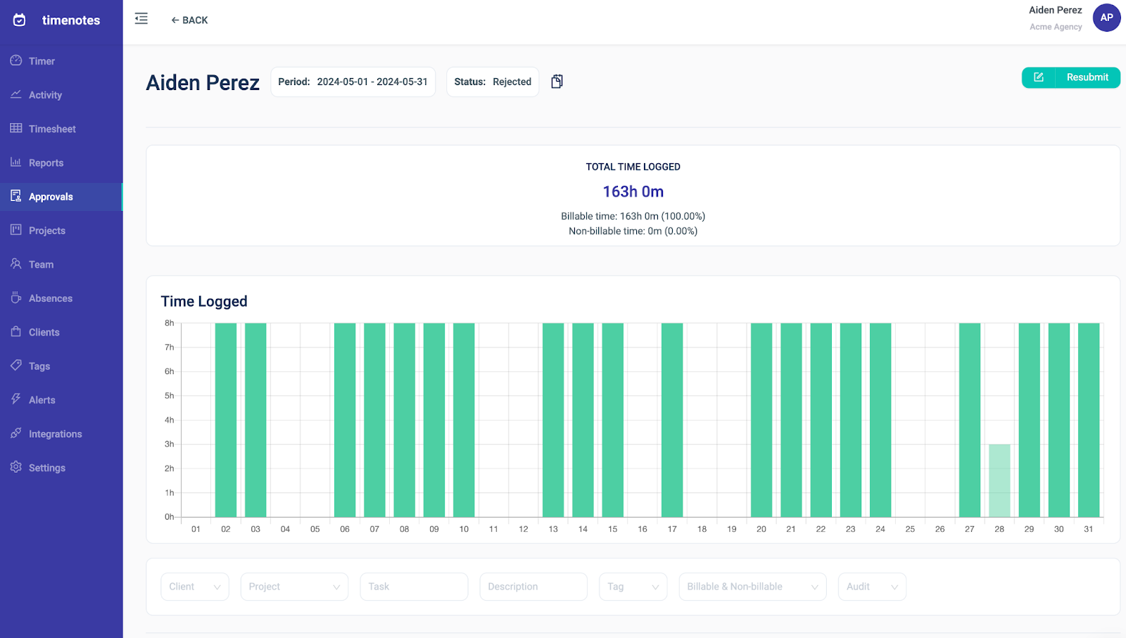 Admins can filter timesheets and decide whether to approve or reject the submitted timesheets.