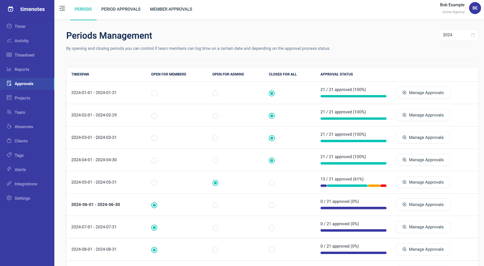 As a workspace admin, the approvals period view gives you an overview of timesheet statuses per period throughout the year. This view helps you manage timesheet locking and ensures all time is submitted correctly, approved by admins, and ready for use in reporting, client invoicing, or any other business activities that rely on accurate timesheet data.