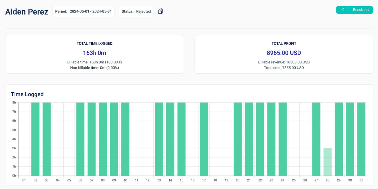 The view displays all the days from a submitted period in a time logging table, enabling admins to clearly review, correct, or add missing time entries. It also offers filtering options for time entries, making it easy to identify what needs to be checked or fixed.