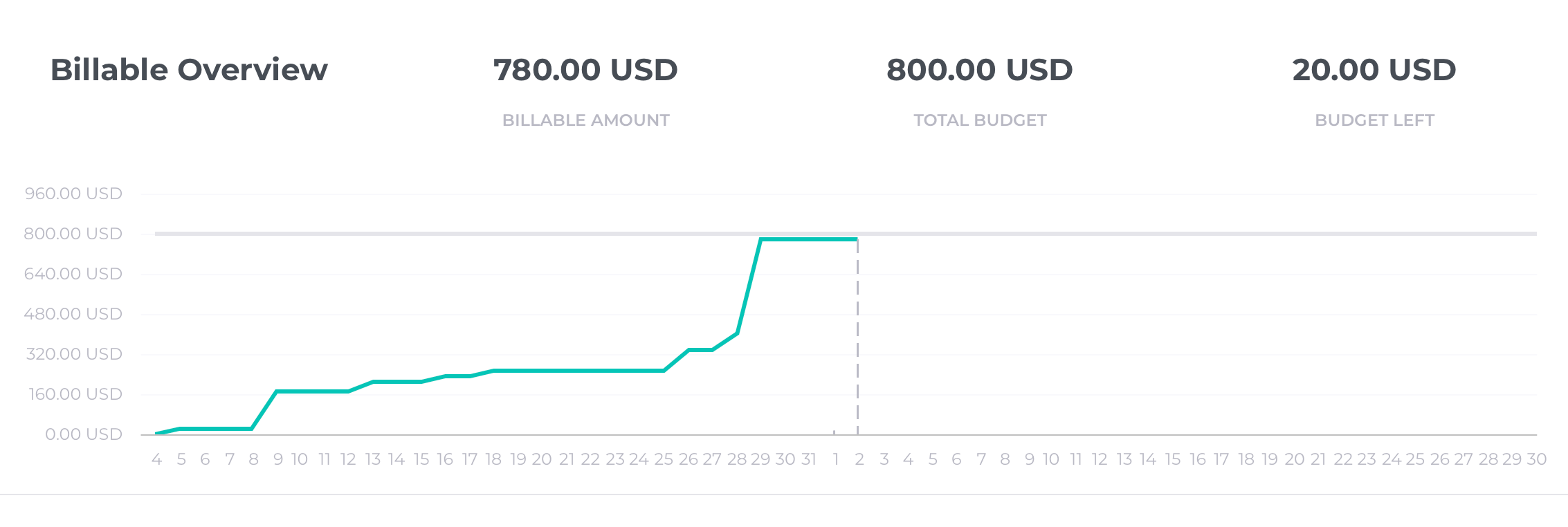 The Billable Overview shows a total amount of a budget, billable amount and left budget. The data are also presented on a timeline so you can assume when the billable budget can be reached.