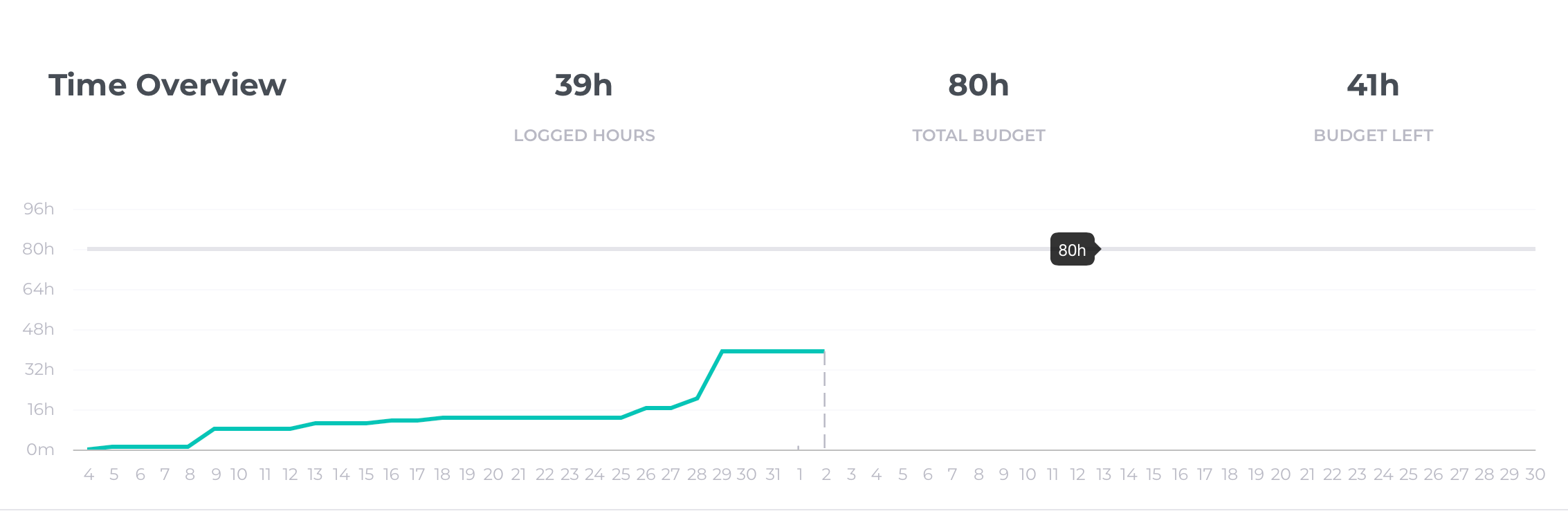 In the Time Overview, you can see a number of logged hours, total hours budget and left hours budget. Below the data, there is a chart which shows logged hours on a timeline. In this way, you can easily notice when most of the work was done. You are also able to observe trends and estimate when the project’s hour budget will be exceeded.