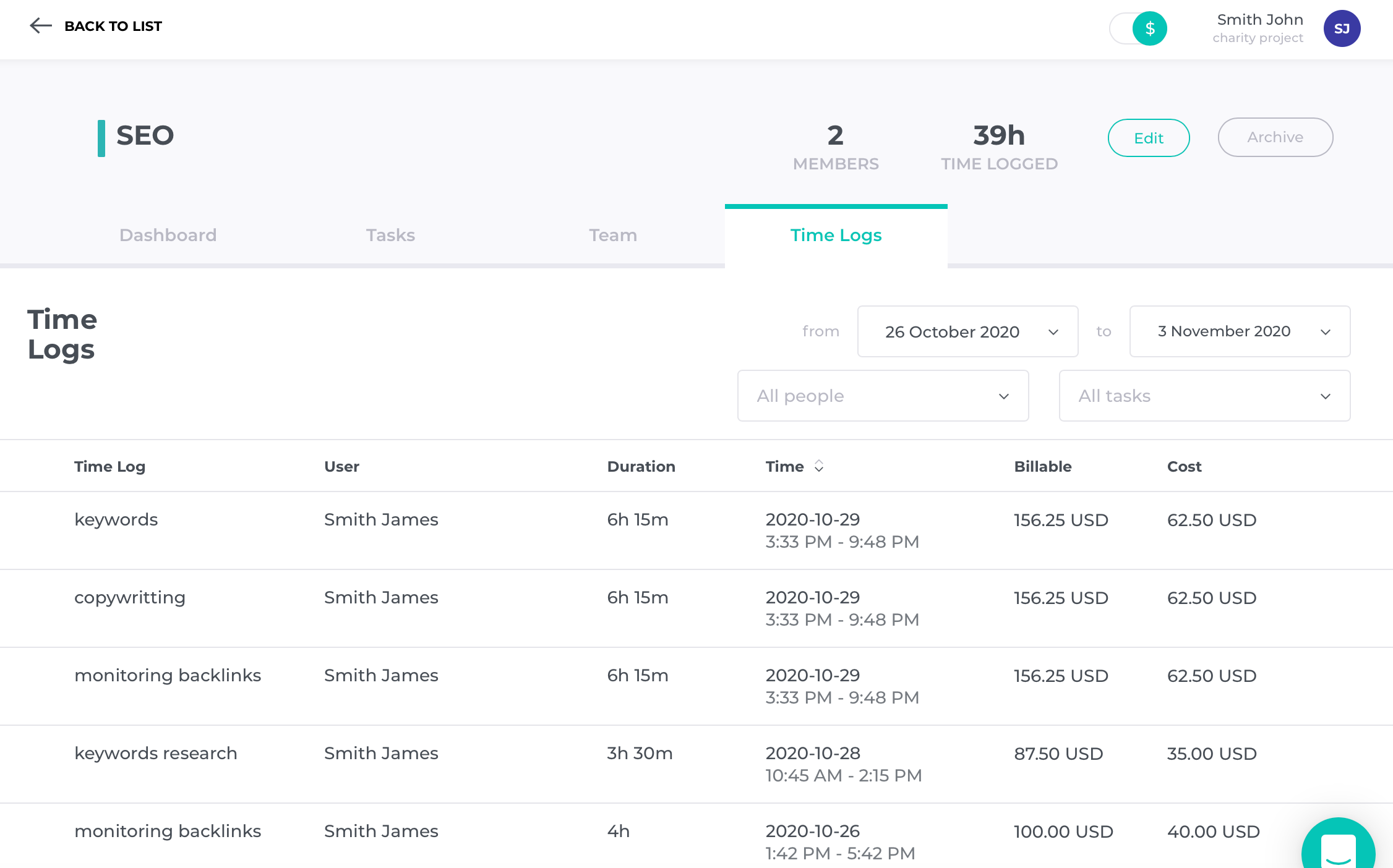Detailed information about cost of the project and tasks, can be found in the 'Time Logs' section. In order to analyze the data quicker and easier, you can specify a timeframe, use filters or change the order of time logs (by clicking on table's headline).