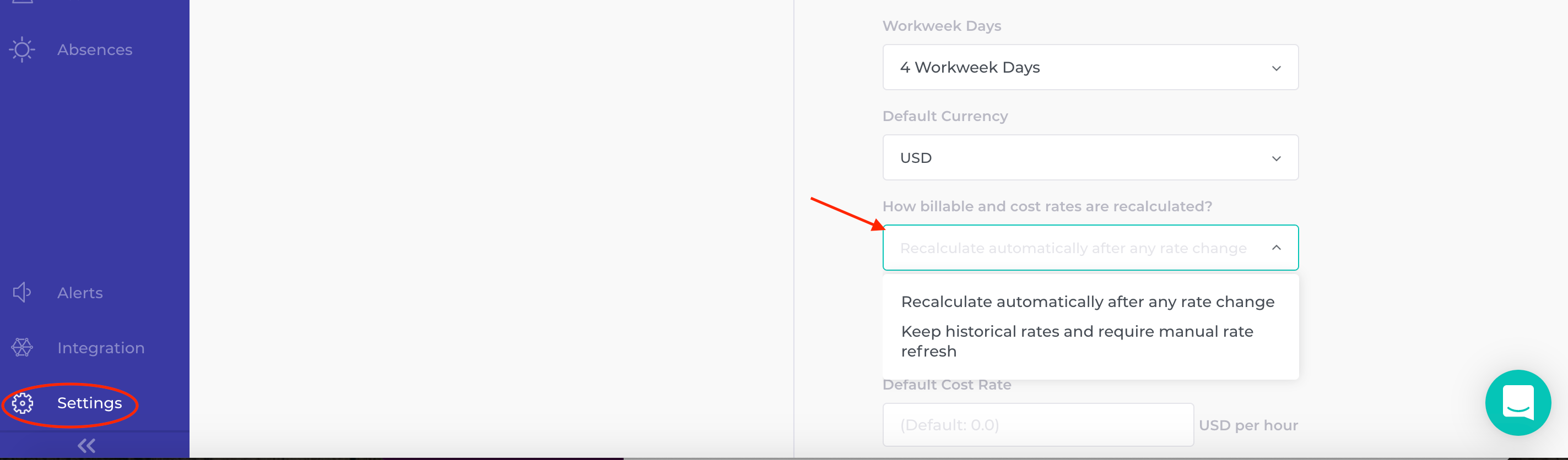 It is crucial to define how cost and billable rate should be recalculated after any change. This option is located in the ‘Settings’ section on the sidebar. After the update, rates can be recalculated automatically or they can require a manual refresh.