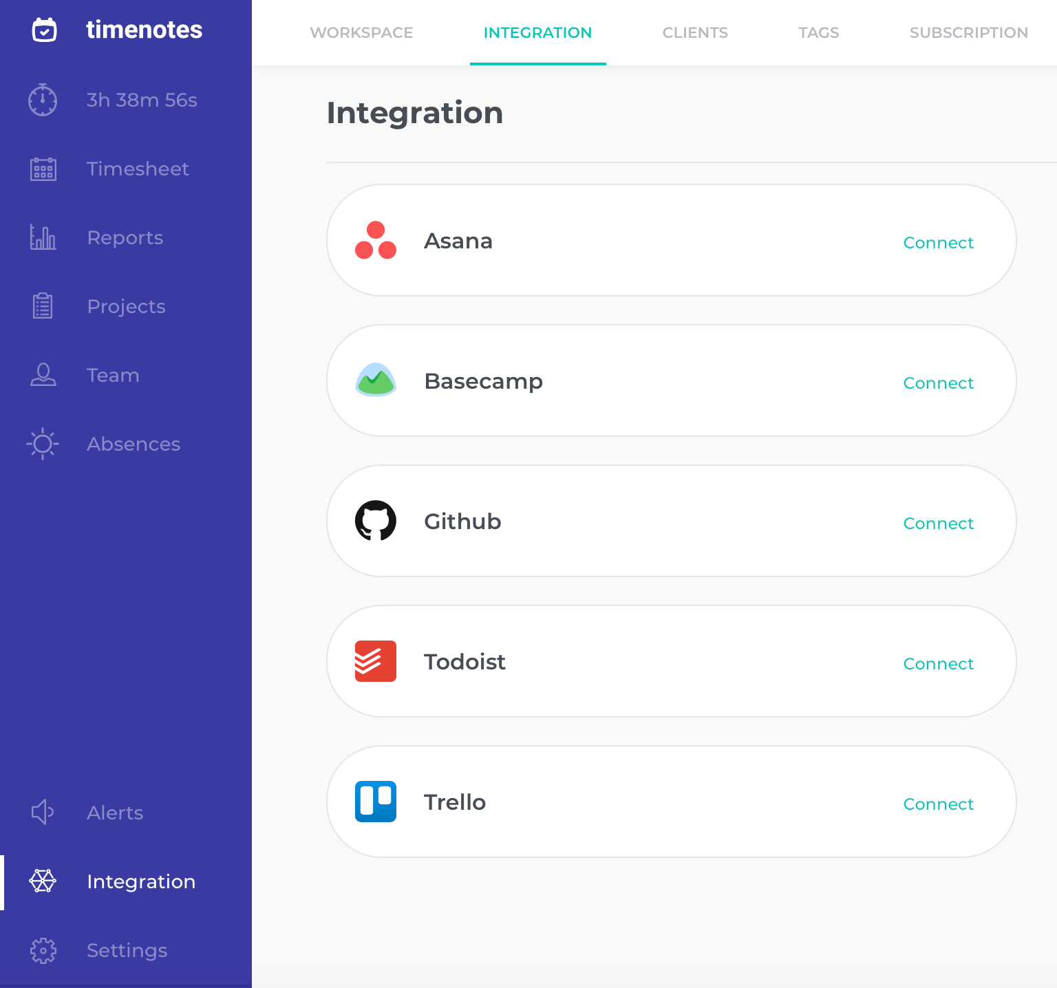 If you work with Asana/Basecamp/Github/Todoist/Trello, integrate it with Timenotes. All your information from the above services will be automatically added to Timenotes. Remember, to make the integration fully work, you should install Google Chrome extensions.