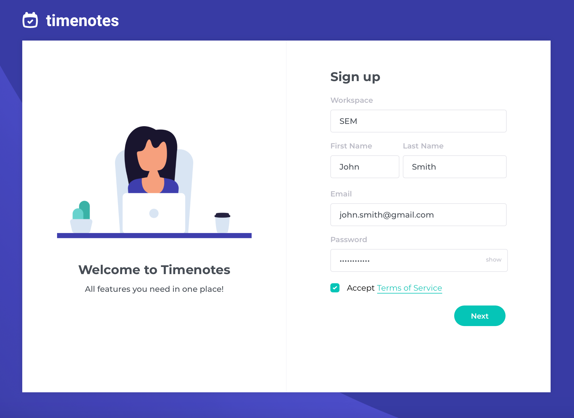 Create a new account to start working with Timenotes. We need just a few basic data from you: email address, first and last name, password. In this step, you can also name your workspace. After that, you will be automatically taken to the software.