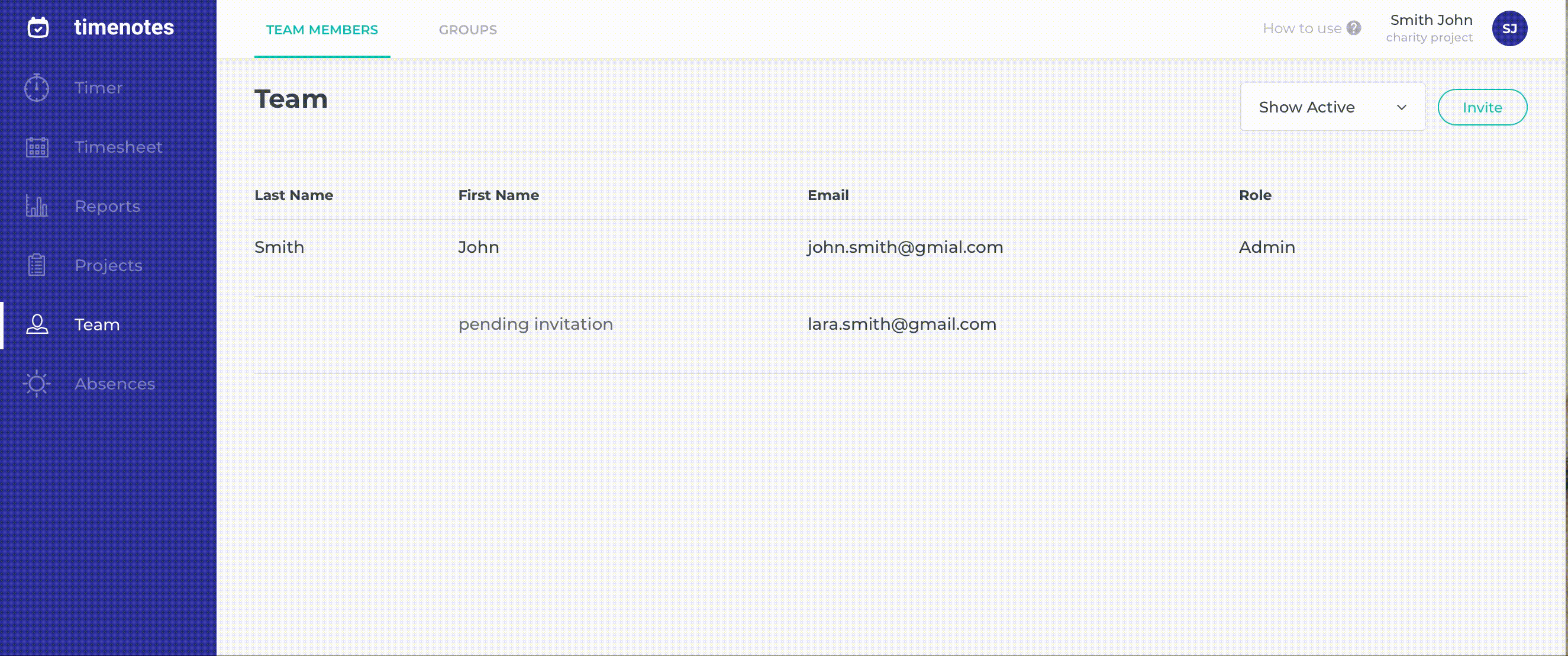 Click the "Invite" button in the team section and enter email addresses of your employees to send them activation links. As long as the invited member does not accept the invitation, you will see it as pending. After they click on the link and set up Timenotes accounts, they will get access to the workspace, public projects and will be able to edit their data in 'Team' section on the sidebar.