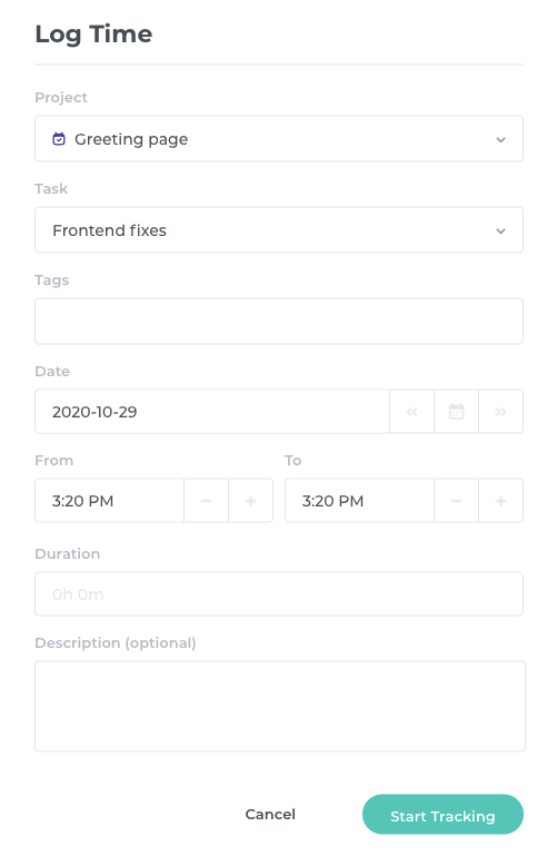 The most common way to track time on Timenotes is to click the "Log time" button, specify what project and task you're working on and click "Start tracking". Leaving the date and time untouched, will enable tracking. Closing the Timenotes tab on your browser will not pause tracking.