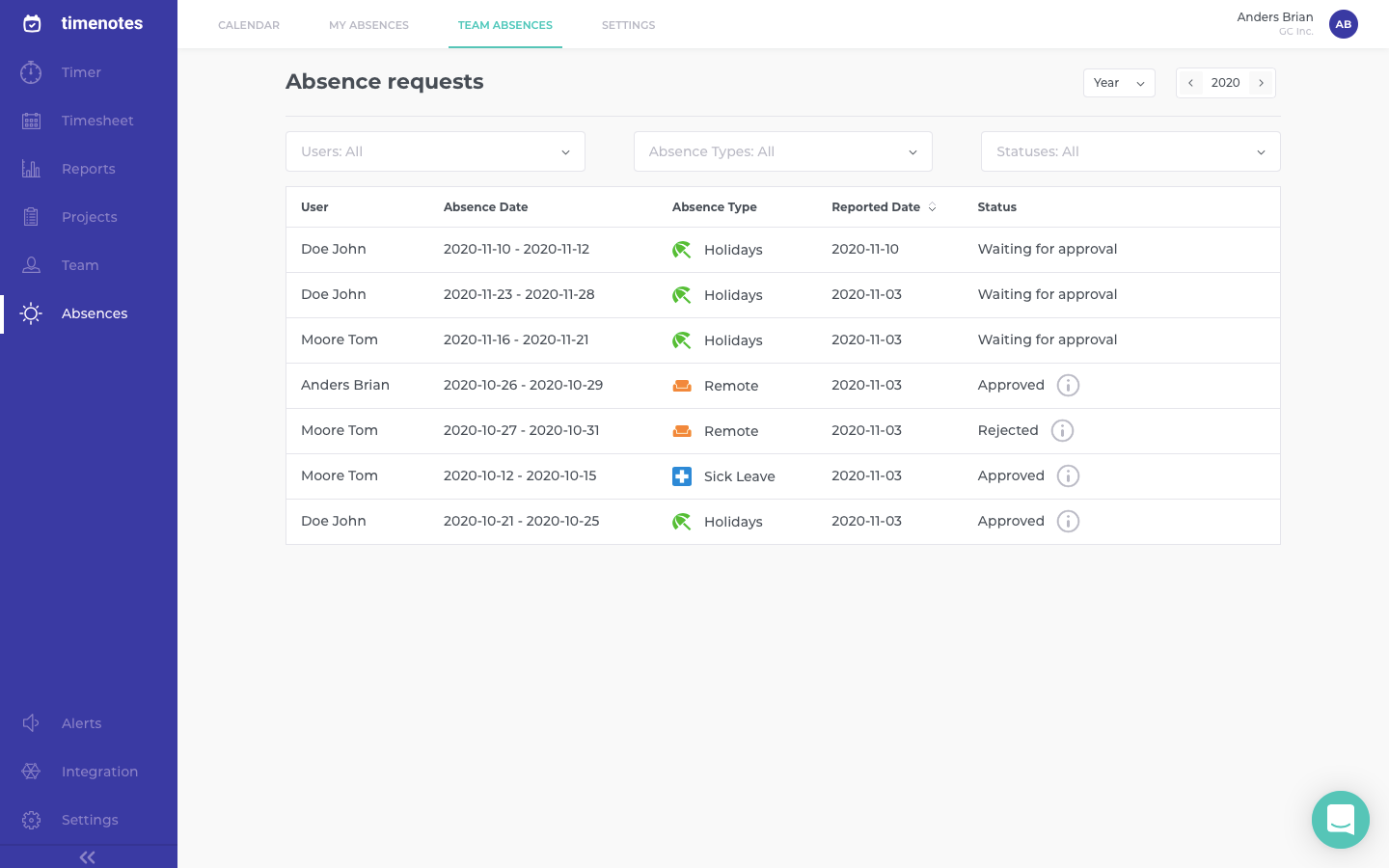 Timenots also lets you track your team's absences. How does it work? Users send absence requests - on delegation, going for a holiday or sick leave and the admin either approves or rejects the request. Absences can be seen in the "Absences" section on the sidebar. Configure which absence types need the confirmation of a superior and how many absences each user is allowed. Attendance tracking and dealing with team absences has never been this easy!