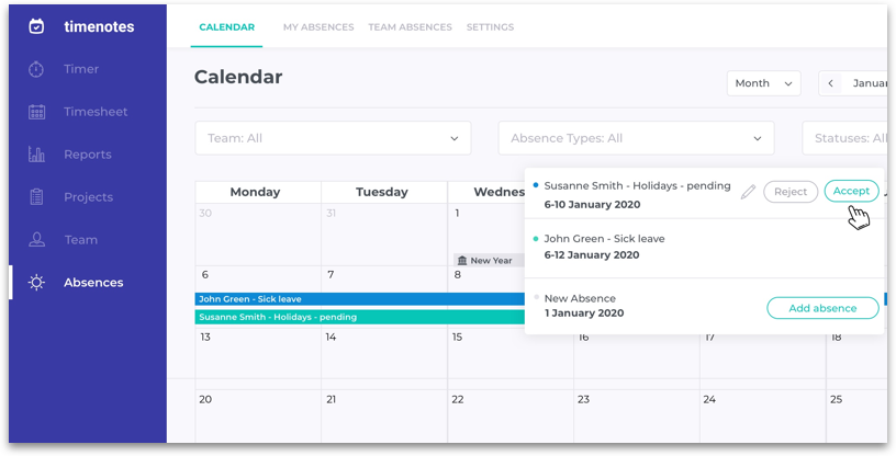 Timenotes fully integrates the absence tracking into centralised timesheet. You can request and approve the team out of office requests, see the banking holidays and get a clear time overview in one view, no more apps switching!